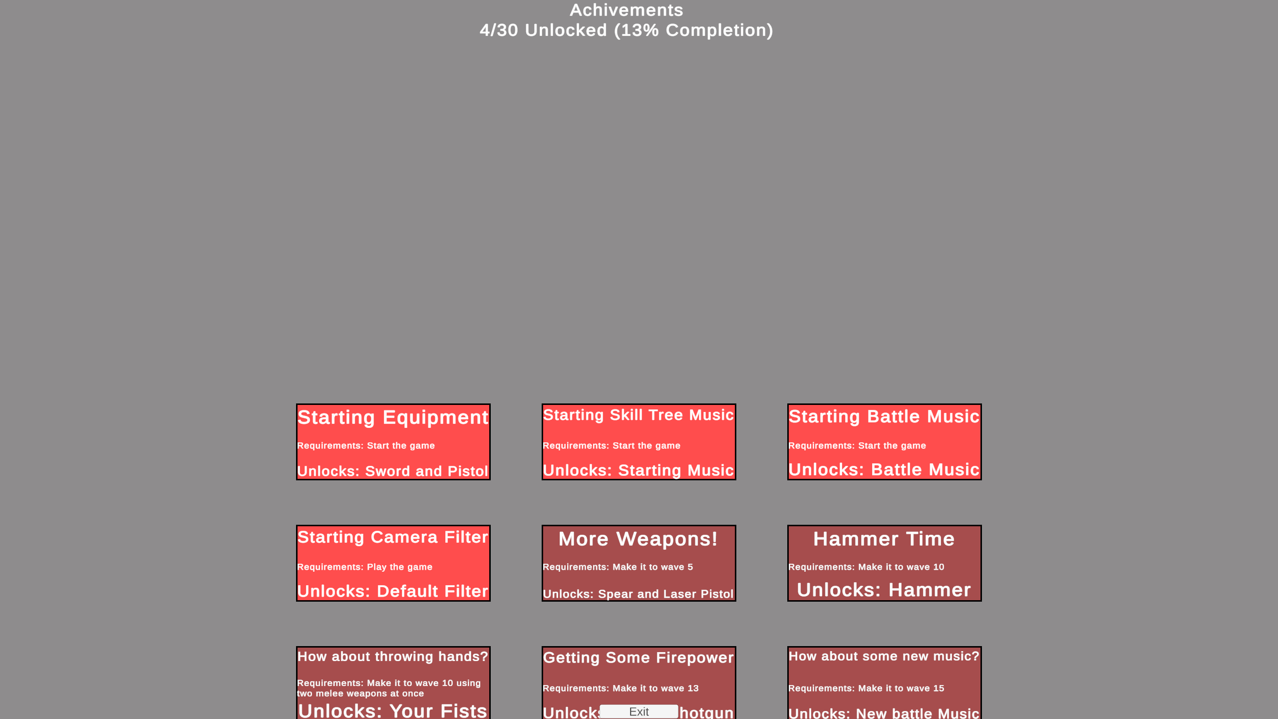 This is a prototype for a game I'm making called bloody hell. You fight as far as you can, and then navigate a massive skill tree to get stronger, however you want. There are multiple weapons, music, and even filters to unlock. This is not the full game or what the full game will look like, but it does show the main gameplay loop. Please enjoy!!!